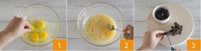 To prepare the Greek omelette, crack the eggs into a bowl and add a pinch of salt 1, beat them for a few minutes with a fork 2 and set aside while you prepare the rest of the ingredients. Slice the black olives into rings 3