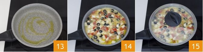 Now heat the oil in a non-stick pan with a diameter of 8-9 inches 13, pour in the egg mixture 14, cover with a lid 15, and cook over low heat for 15 minutes.
