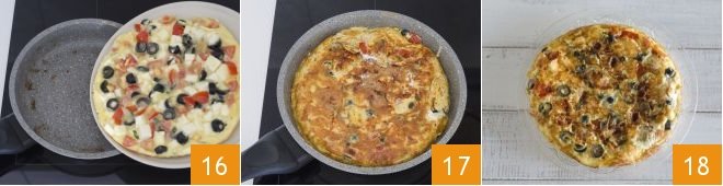After this time, flip the omelette with the help of a flat plate 16, slide it back into the pan 17 and continue cooking for about 5 minutes, always with the lid on. When the other side is cooked, your Greek omelette is ready to be served 18!