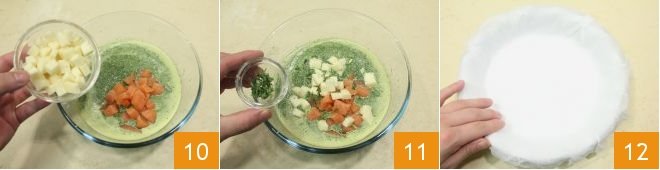 pour the egg mixture inside 13, distribute the salmon 14 and the toma 15 you set aside on top.