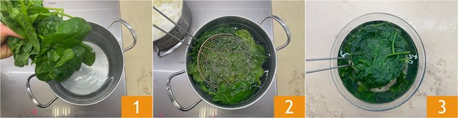 To prepare the green ravioli stuffed with cod, start with the fresh pasta: briefly blanch the washed spinach in boiling water 1. Drain them and let them cool in ice water 3.