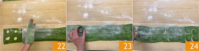 Roll out the pasta with a pasta machine to a thickness of about 1/8 inch 19, cut out long rectangles 20, fill half of the sheet with the filling, squeezing well-spaced balls 21.