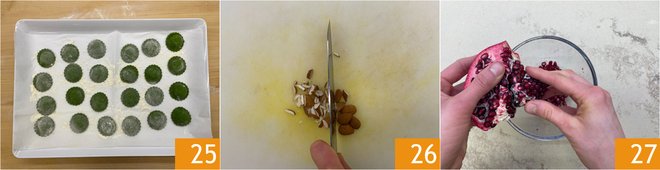 As you form the green ravioli, place them on a floured tray 25. Move on to the dressing: chop the almonds 26 and deseed the pomegranate 27.