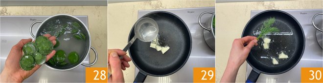 Cook the ravioli in plenty of salted water 28 until they float. In a pan, melt the butter with a scant ladle of pasta cooking water 29 and the dill 30.