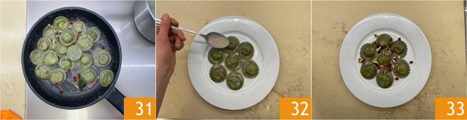 Drain the ravioli here 31 and add the pomegranate seeds, sauté for a moment to flavor them. Serve the green ravioli stuffed with cod with their dressing 32 and garnish the plates with chopped almonds and pomegranate 33.