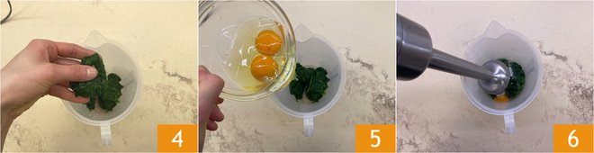 Squeeze the spinach well and pour them into a tall glass 4, add the eggs 5 and blend everything with an immersion blender 6 until you obtain a homogeneous puree.