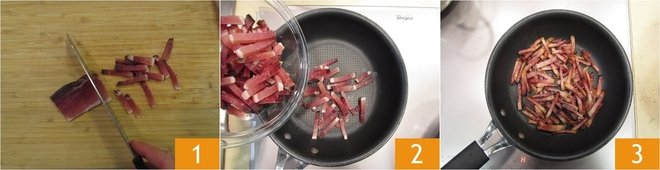 To prepare the green risotto with speck and watercress, start with the speck. Cut it into strips about 1/8 inch thick 1 and transfer it to a preheated pan 2; let it toast until it becomes crispy 3, then turn off the heat. This will take a few minutes, in the meantime, you can start preparing the risotto, stirring the speck occasionally.