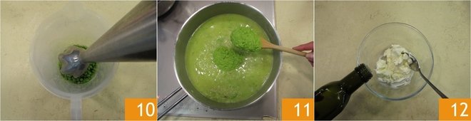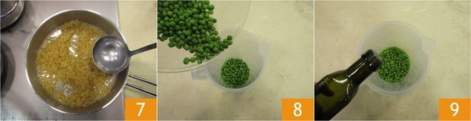 Begin cooking the rice by adding boiling water as needed, until it covers the rice and stirring occasionally. Meanwhile, pour the raw peas into a tall, narrow container 8. Add a drizzle of olive oil 9 and a pinch of salt.