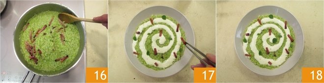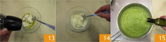 Season with salt and pepper 13 and mix with a spoon until you get a cream 14. If it is too thick, add a little water. As soon as the rice is cooked, turn off the heat. Cream with a drizzle of olive oil 15.