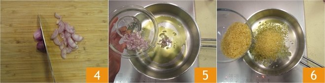 Firstly, put a pot full of water on the stove and bring it to a boil. Take the shallot and slice it finely 4. Pour a drizzle of extra virgin olive oil into a pan, add the shallot 5 and let it sauté on low heat for a couple of minutes. At this point, add the rice 6, season it with salt and toast it on high heat, until the grains change color.