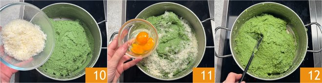 With the heat off, add the grated cheese 10 and the egg yolk 11, then mix everything well with a spatula 12.
