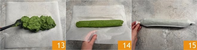Pour half of the mixture in the center of a sheet of parchment paper 13, then shape it into a cylinder about 1.25 inches in diameter 14. Wrap the cylinder in the parchment paper, twist the ends to seal it 15, and let it cool completely; it will take about 15-20 minutes, or you can keep them in the refrigerator overnight. Proceed in the same way with the remaining half of the mixture.