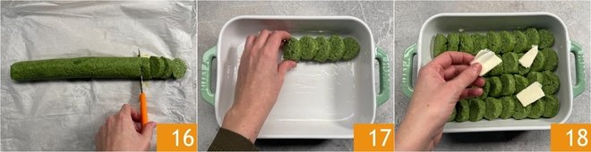 After the cooling time, grease a smooth-edged knife and cut the roll into disks about 0.5-0.6 inches thick 16. Place the disks in a buttered baking dish measuring 7x10 inches, forming several rows and slightly overlapping them 17. Sprinkle the surface with small knobs of butter 18.