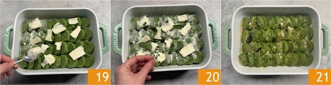 Finally, sprinkle with grated cheese 19, add a few leaves of thyme and sage for aroma 20, and pepper. Bake in a preheated static oven at 392°F for about 20 minutes, then switch to grill mode for 2-3 minutes. When they form a nice crust, remove the green Roman-style gnocchi from the oven and serve immediately 21!