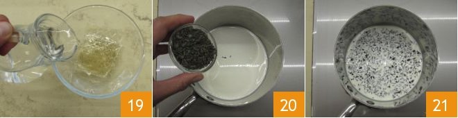 Soak the gelatin sheets in cold water 19. Simmer 0.4 cups of cream and the tea in a small saucepan 20 21.