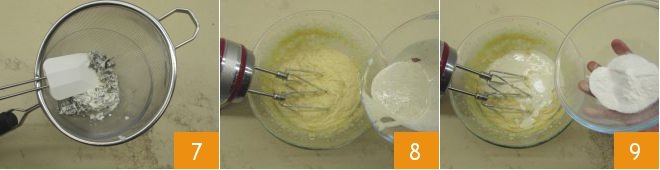 then strain the cream and tea mixture through a sieve 7 and add it to the mixture 8. Work with the beaters until you obtain a smooth batter and add the rice flour and baking powder 9. Work for about a minute.