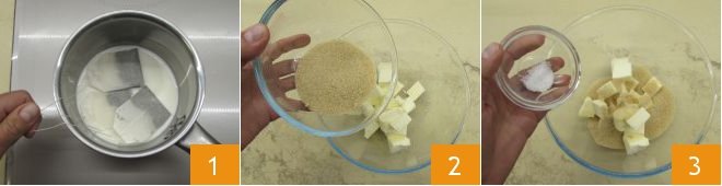To prepare the green tea cookies, first heat the milk in a small saucepan, steep the tea bags 1 and let it cool off the heat. Meanwhile, place the softened butter in a large bowl with the brown sugar 2 and salt 3.