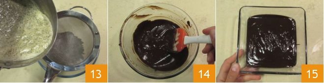 At this point, strain the cream and pour it hot over the chopped chocolate 13, then mix with a spatula to obtain a smooth and shiny cream 14. Cover with cling film in contact and let it rest in the refrigerator for about 30 minutes 15.
