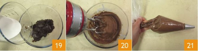 Meanwhile, take the ganache out of the refrigerator and add the remaining 3.5 oz of cold cream 19, then lightly whip the cream with an electric mixer 20 and transfer it to a piping bag 21.