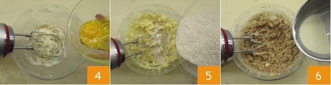 Start whipping the mixture with an electric mixer, then add the egg yolks 4 and continue to mix until fully absorbed. At this point, add the type 2 flour and once incorporated, pour the flavored milk 6, continuing to mix with the beaters.