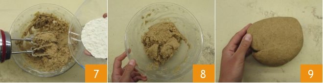 Finally, add the all-purpose flour 7 and mix for about a minute until you get a homogeneous mixture 8. Transfer it to the work surface and form a smooth and compact dough 9, cover with plastic wrap and let it rest in the refrigerator for at least an hour.