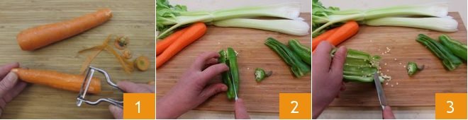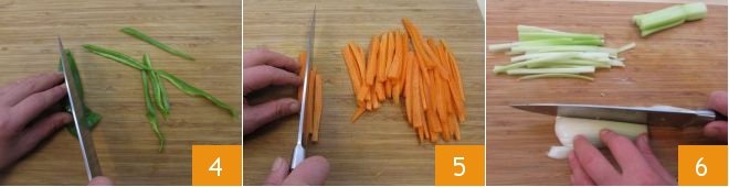 Julienne the peppers 4, carrots 5, and the celery stalk 6. Set the vegetables aside,