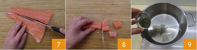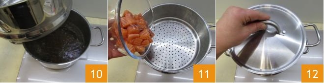 bring to a boil and insert the steamer basket 10, then add the salmon cubes 11 and cover with the lid 22; cook the salmon for 2-3 minutes.