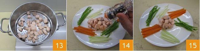 Indeed, just a few minutes will be enough for it to be cooked and pink 13. Serve it on serving plates accompanied by the sliced vegetables, seasoned with pepper to taste 14, and your green tea salmon bites with vegetables will be ready to be enjoyed 15.