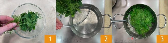 Transfer the herbs into a bowl with ice water (to cool them and keep the color vibrant 4. Squeeze them well and place them into a jug, then add the oil 5 and salt 6.