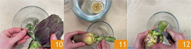 Now for the artichokes: peel them 10, cut off the initial part of the stem 11, and peel it 12.