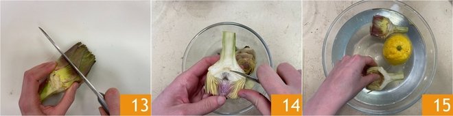 Remove the tougher tips 13. Cut the artichokes in half and remove the inner choke with a small knife 14, then immerse them in water and lemon to prevent browning 15.
