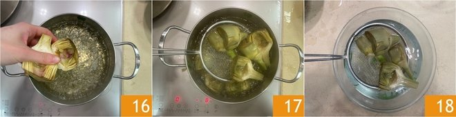 Boil the cleaned artichokes for 5 minutes in the same water used to blanch the herbs 16, then drain 17 into ice water until they are cooled 18.