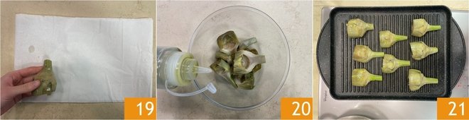 Dry them with paper towels 19 and season with oil and salt in a bowl 20. Grill the artichokes on a well-heated grill for 5 minutes on each side 21.