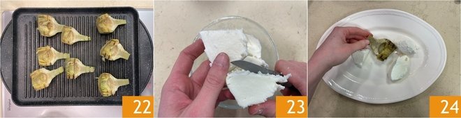 They should have the typical grill marks 22. Meanwhile, drain and cut the fresh mozzarella into pieces 23. You are ready to plate: arrange the artichokes and mozzarella on the plate 24.