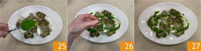 Drizzle with the aromatic sauce 25, then finish with capers 26 and a sprinkle of pepper. Enjoy your grilled artichokes with fresh mozzarella and herb sauce immediately 27!