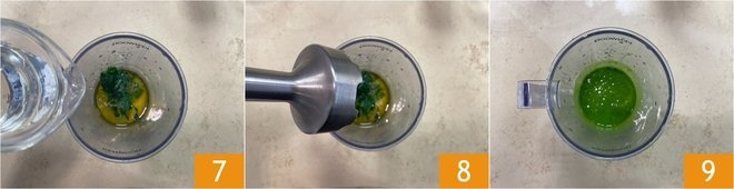 Add the water 7 and blend well with an immersion blender 8 to obtain a smooth sauce 9.