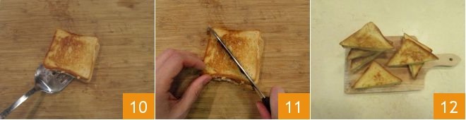 Cover with a lid 7 and wait a couple of minutes. Flip the sandwich, press it slightly 8 to aid the cheese melting; cover again 9 and cook for another minute.