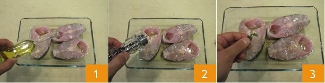 To prepare the grilled gilthead bream fillets, start by marinating the fish: place the fillets in a bowl, add 1/4 cup of oil 1, salt, pepper 2, and the thyme leaves 3. Cover with plastic wrap and place everything in the refrigerator for about 20 minutes.