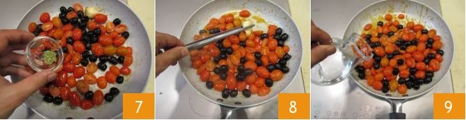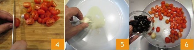 At this point, prepare the side dish by cutting half of the cherry tomatoes in half 4 and leaving the others whole. Pour 2 teaspoons of oil in a pan and add a clove of garlic in its skin, but slightly crushed 5. Let it brown and add both the cherry tomatoes and the black olives 6.