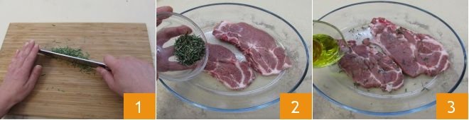 To prepare the grilled meat, first take care of marinating the meat. Chop the rosemary 1 and divide it into two parts. Place the chops in a baking dish, add half of the rosemary 2, the oil 3, salt, and ground pepper. Gently massage the meat to season it and set it aside.