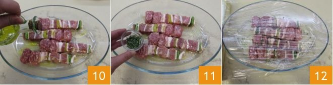 After about 6 hours, focus on marinating the skewers, as they require a shorter marinating time due to the presence of vegetables. Place the skewers in a baking dish and add the oil 10, salt, chopped rosemary 11, both ground and whole black pepper. Massage the skewers with your hands, cover with plastic wrap 12, and refrigerate to marinate for 2 hours.