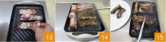 After the marinating time, start cooking the ribs. Place them on a hot grill 13, let them brown, and turn them 14, then continue cooking, turning them occasionally. A total of 20 minutes of cooking will be needed. Once cooked, place them on a plate 15 and cover them with aluminum foil.