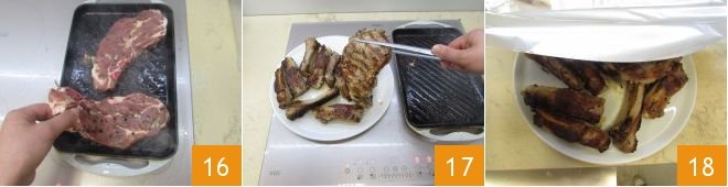 At this point, place the chops on the grill 16 and cook them for about 15 minutes, turning them halfway through. Once cooked, place the chops on the same plate as the ribs 17 and cover again with aluminum foil 18. If your grill is large enough, you can cook ribs and chops together, paying attention to the slightly different cooking times.