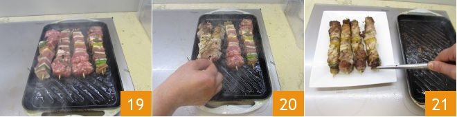 Once the chops are cooked, focus on cooking the skewers. Lay them on the grill 19 and cook them for about 3-4 minutes per side, browning them on all 4 sides 20. A total of about 15 minutes of cooking will be needed. Once cooked, place them on a tray 21 and cover them with aluminum foil.