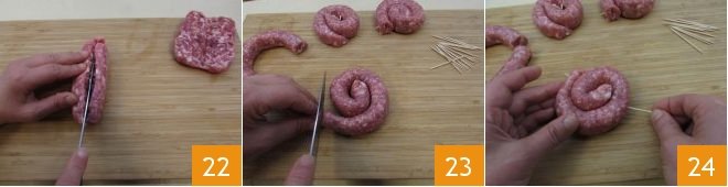 Meanwhile, as the skewers are cooking, take the sausage and cut it in half, but do not separate it completely, then open it like a book 22. Also, take the luganega sausage, twist it once and a half, cut the remaining part 23, and secure your sausage coil with skewers 24.