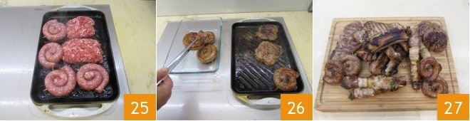 Place both types of sausage on the hot grill 25 and cook the sausage for 4-5 minutes per side, while the luganega will take 3-4 minutes per side. Once the sausages are cooked, place everything in a baking dish 26, heat up the other meats, and serve your grilled meat immediately 27!
