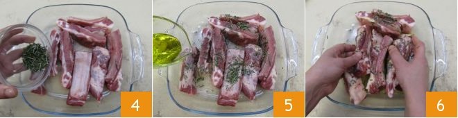 Place the ribs in another baking dish and repeat the same operation, i.e., add the remaining rosemary 4, the oil 5, salt, and ground black pepper. Massage the ribs with your hands as well 6.