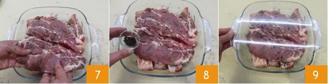 For convenience, place the chops over the ribs 7, add the black peppercorns 8, cover with plastic wrap 9, and let the meat marinate in the refrigerator for 8-10 hours.