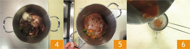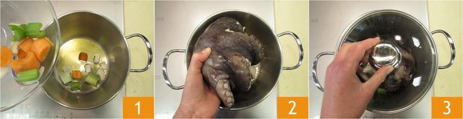 To prepare grilled octopus with its mayonnaise, you'll need a cleaned and eviscerated octopus. In a large pot, add the coarsely chopped vegetables: celery, carrot, and onion 1. Also add the already eviscerated octopus 2, cover with a lid and cook on low heat for 60 minutes 3.