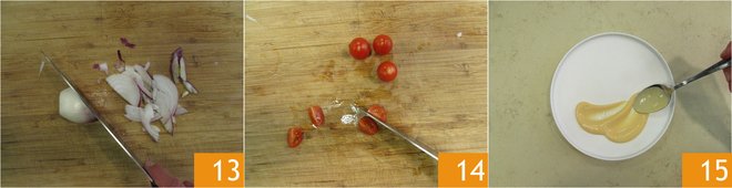 Clean and thinly slice the spring onion 13, wash and cut the cherry tomatoes 14. Then you can plate: place a little mayonnaise on the plate 15